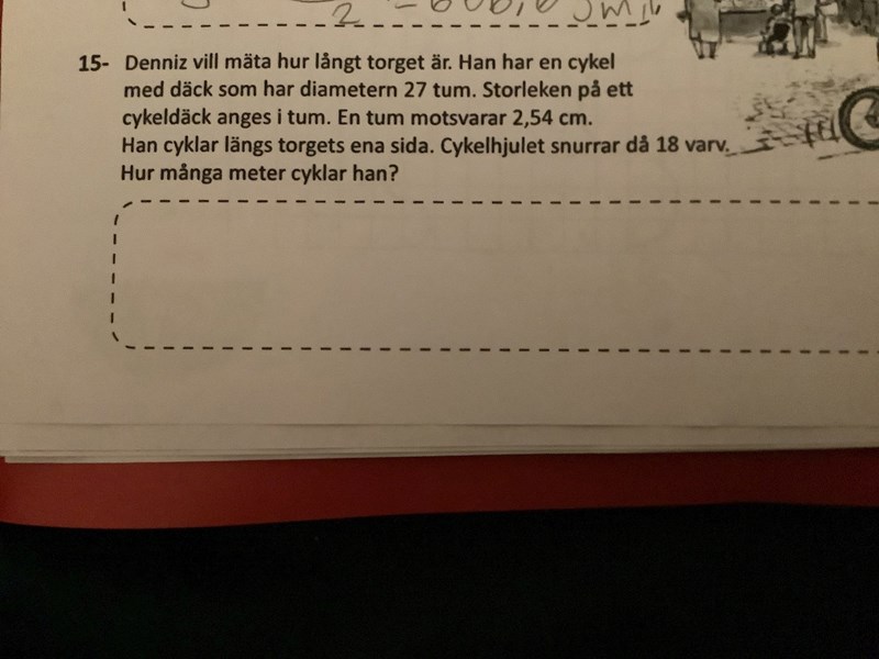 2. Om hjulet har snurrat 1 varv så har cykeln åkt lika mycket som däckets omkrets. Hur långt motsvarar 18 varv?
