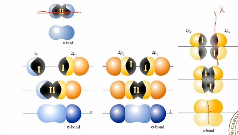 Denna bild används i en Powerpoint för att förklara skillnaden mellan en pi- och sigmabindning. Dets sägs att elektronerna i den högersta figuren inte är symmetrisk runt bidningsaxeln och har därmed låst rotation. Det jag till att börja med undrar över är om det finns en systematisk namngivning kring x,y och z, eller om man har valt dem slumpartat för att särksilja dem. På bilden ser vi t.ex att 2pz-orbitalerna är symemtriska kring x-axlen, och inte z. Samma gäller för 2px, som sträcker sig över y-axlen och inte x.