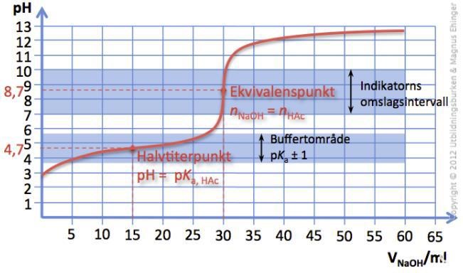 Jämför hur väl pH buffrades av HAc mellan 5 och 27 ml NaOH, med hur dramatiskt pH ökade mellan 27-33 ml - ca 6 pH enheter!