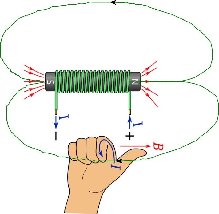 Fältet ut från spolens nordända går i en cirkel tillbaka till sydändan. Precis som för en stavmagnet.