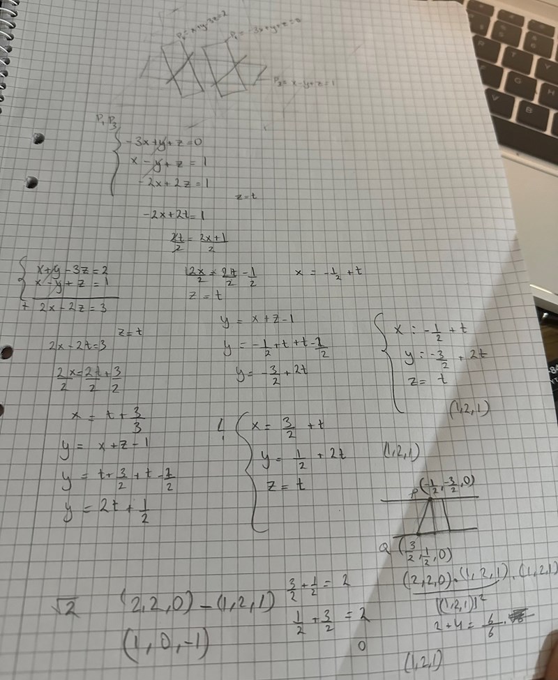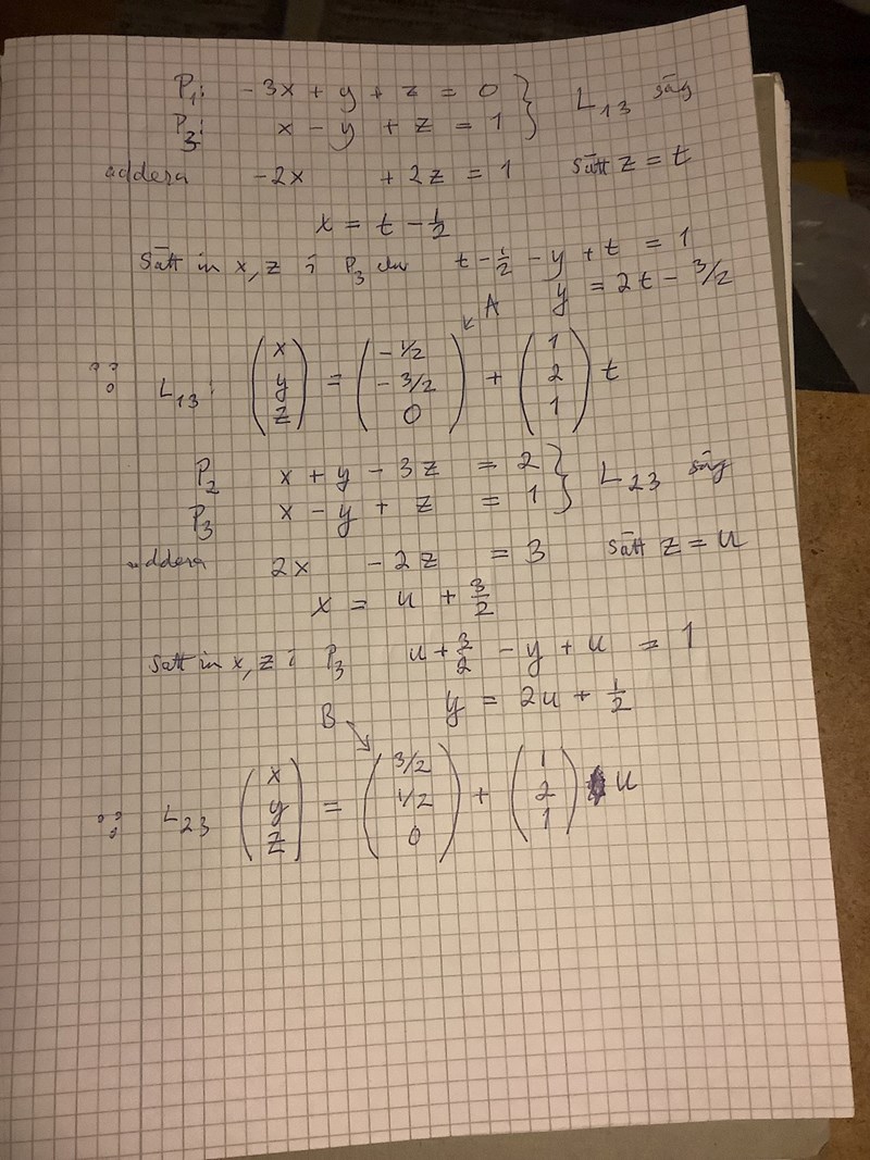 och L23 går genom B = (3/2, 1/2, 0). (Se bifogad bild.)