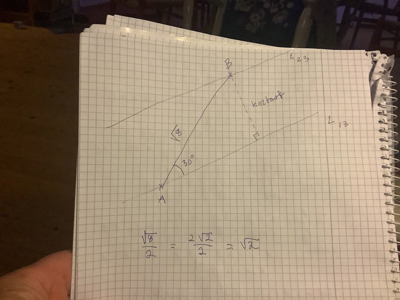 AB är den längsta sidan i en 30-60-90-graderstriangel där den kortaste sidan är det sökta avståndet. I en sådan triangel är kortaste sidan hälften av den längsta.