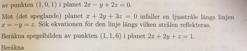 Jag ritade till en början en bild av frågan. Jag tog fram en riktningsvektorn för den infallande strålen. Projicerade den på planets normalvektor, kalla den vektor V2. Därefter subtraherade jag V2 från vektor på infallande linjen som beskriver strålen varvid en ny vektor alstrades. Den nya vektorn adderat med normalvektor ger oss riktningsvektorn för den sökta linjen, vilken med hjälp av vi kan beskriva den linje vilken strålen reflekteras.