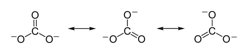 Resonansstabiliseringen (när bindningarna lagras om mellan olika atomer, i detta fall syns det tydligast då dubbelbindningen lagras om till de olika syreatomerna), sker så snabbt att man brukar säga att det finns lika stora delar av de tre formerna vid varje tillfälle - det är m.a.o. ett mellanting mellan de tre olika formerna (i bilden) som finns.