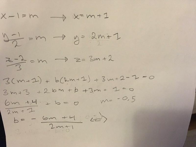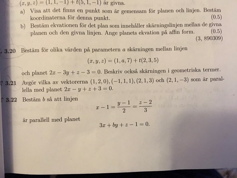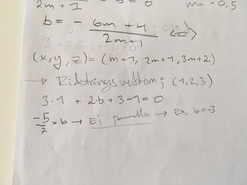 Jag har svårt med att komma vidare på uppg. 22. Mitt försök syns ovan. De är pararella när de inte skär varandra vilket är då de saknar lösning. Jag har uttryck b i m, då de har en lösning, vilket är för många tal. b blir odefinierad då m=-0.5 och =0 när 4/6. m=-0.5 alstrar i planet skrivet på affin form, 1=0, och i linjens ekvation uppfylls olikheten. Funkar b som lösning? Det känns som något går fel, Tacksam för all hjälp jag kan få.