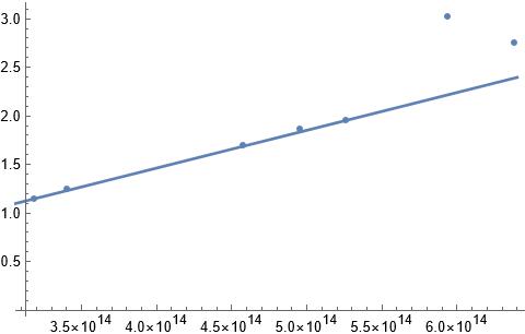 Riktningskoefficienten för den linjära anpassningen blir k=3.88736*10-15V/Hzk=3.88736*10^{-15}\mathrm{V/Hz} och därmed blir ett närmevärde