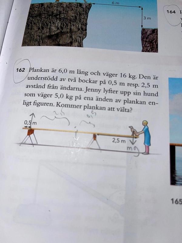 Jag får att F är 63 N vilket är mindre än 16g och 5g tillsammans. Alltså kommer plankan inte välta… Det känns som att det är något som fattas eller något fel i min förklaring ..?
