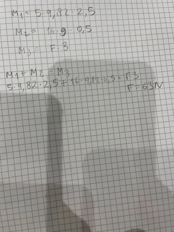 Detta ger oss att M1+M2=M3 om (jämvikt råder). Jag vill hitta F för att sedan jämföra om F är större än 16g och 5g tillsammans (tyngdkraften för brädan och hunden).