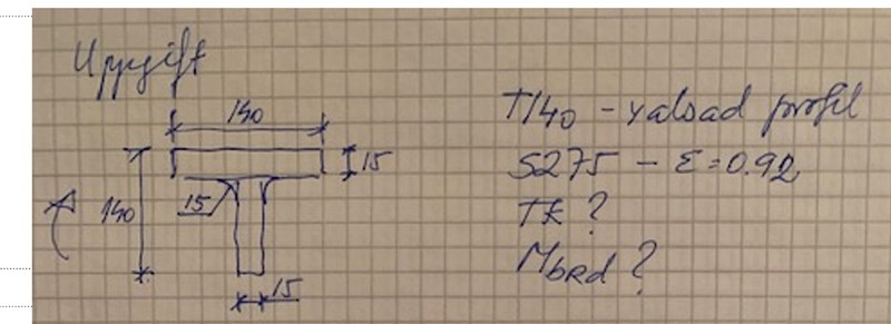 Problemet berör en balk med detta tvärsnittet. I en tabellsamling har jag hittat TP (jag har också sökt TP själv genom masscentrums ekvation och det verkade sammanfalla med +-1. mm). Eftersom problemet berör ren böjning borde TP sammanfalla med neutrallager.