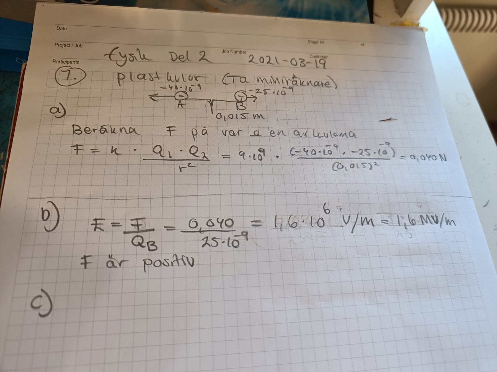 b) Hur stort är det elektriska fältet från kula A där kula B befinner sig och vilken riktning