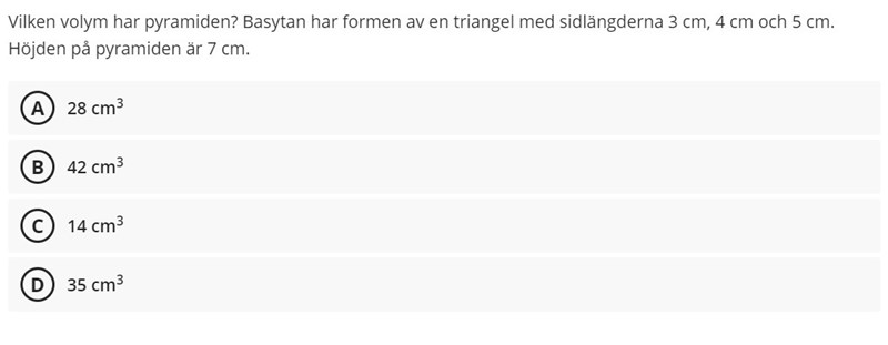 Till volymenheten av pyramiden räknade jag V= 3*4*7/3=28 cm3 ELLER V=3*5*7/3=35cm3