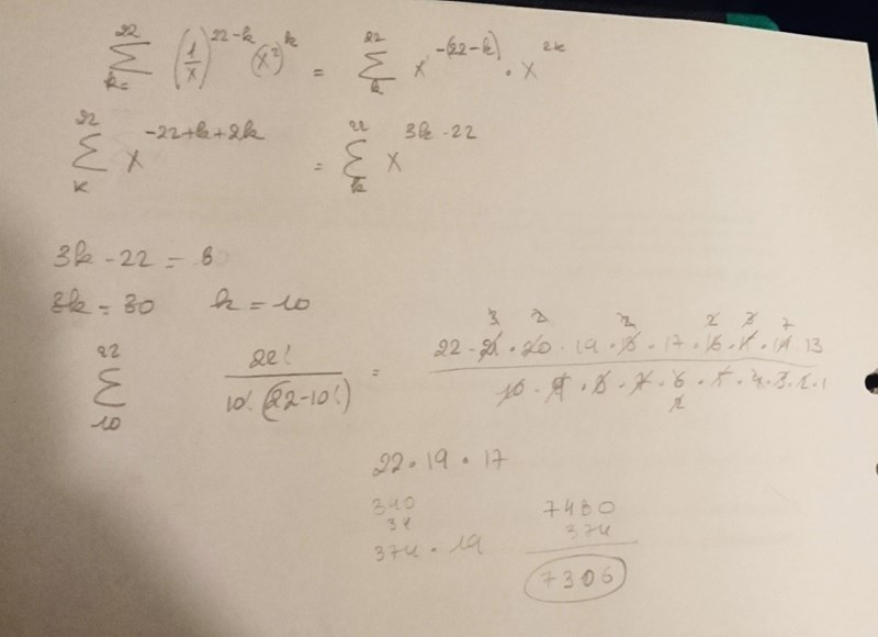 (1x)22-k(x2)k=x2k-(22-k)=x3k-22 .(\frac{1}{x})^{22-k}(x^{2})^{k} = x^{2k-(22-k)} = x^{3k-22}\ .