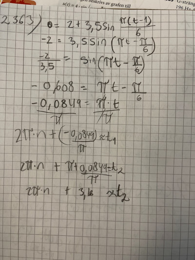 Då vet du alltså att uttrycket som är argumentet för sinus skall ha värdet 3pi/2 + 2pi•n. Vilka värden kan t ha, för att detta skall vara sant?