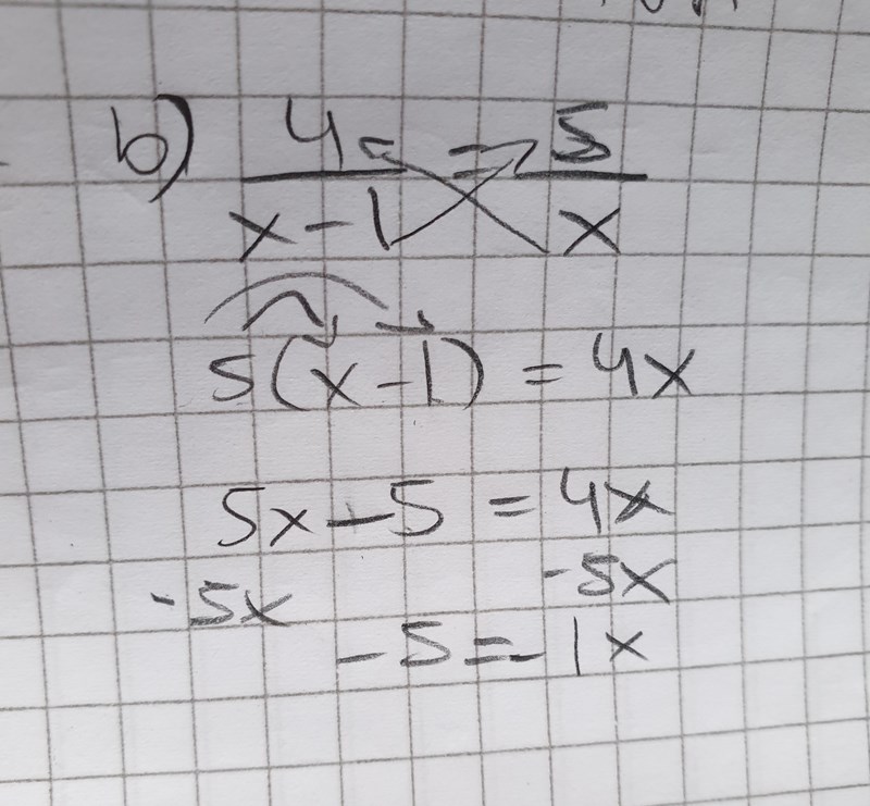 -5=-x multiplicera in minus på båda sidor ger 5=x