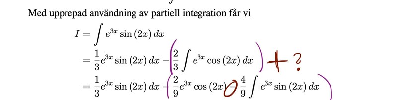 Detta för att du då får ett minustecken från den partiella integrationen och ett minustecken från derivatan av cos(2x). Alltså ett plustecken.