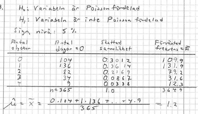 Jag sitter med lite ex-tentor och stött på den här uppgiften. Vill tillägga att det är läraren själv som gjort lösningarna men jag får verkligen inte ihop den här. Den skattade sannolikheten får jag då x är poissionfördelat (my är 1,2) till Pr (x=0) = 0,3012, Pr (x=1) = 0,3614, Pr (x=2) = 0,2169, Pr (x=3) = 0,0867 hittils stämmer allt men den sista Pr(x=4) = 0,0260 är ju inte samma som 0,0338 som det står i tabellen ovan. Har jag eller läraren gjort fel? Sedan får jag även mina sannolikhetssummer till 0,9922 och i tabellen står det 1, men antar att inte sannolikheten måste vara exakt 1?