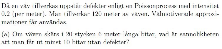 Hondel skrev:Ja, man använder Poisson-fördelningen. Låt X=Antalet defekter på 6 meter. Det gäller då att X~Po(6*0.2)=Po(1.2).