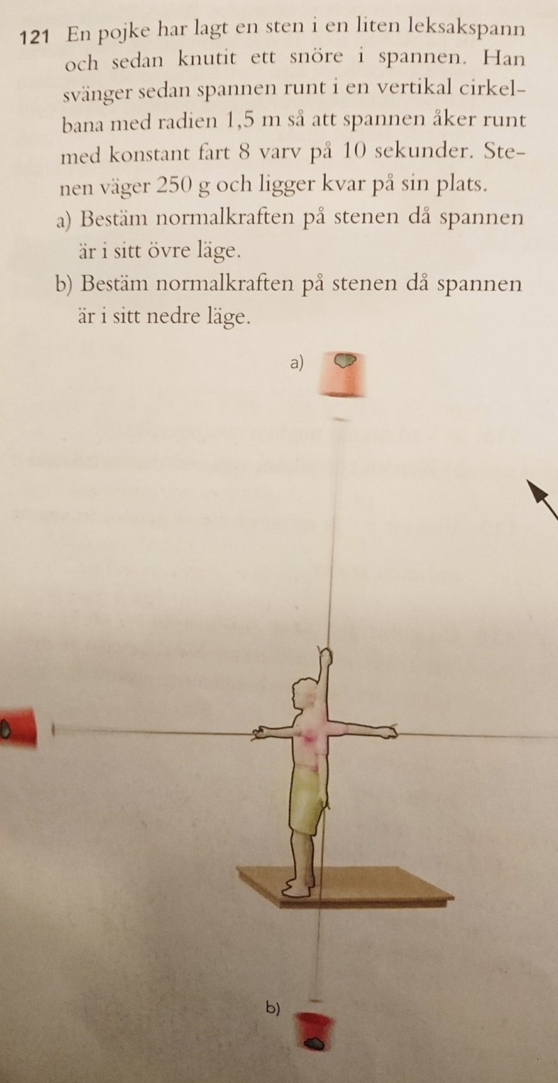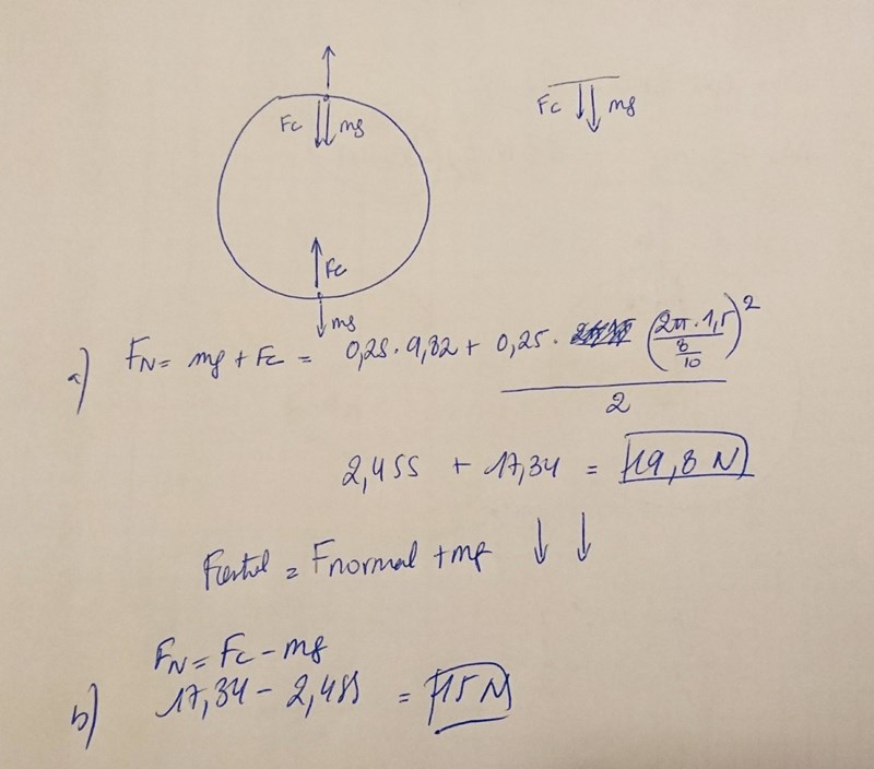Där är centripetalkraften, är gravitationskraften och är normalkraften (alla ska utgå från samma punkt). Sen vet man att , så man får alltså att normalkraften fås av