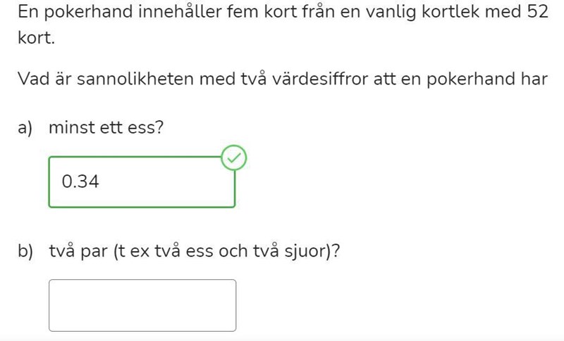 Hej jobbar med följande uppgift och vet inte hur jag ska lösa b). Det jag har än så länge gjort är att jag tänker mig för att bestämma alla gynnsamma utfall så tar jag "52 över 2" och sedan "48 över 2" och multiplicerar med varandra fast jag måste dela dem med något eftersom det räknas med alla möjliga 2 kort man kan få. Sedan borde jag multiplicera det jag får där med 44 för att få fram alla möjliga gynnsamma utfall och dividera med alla möjliga utfall från uppgift a) som är "52 över 5"