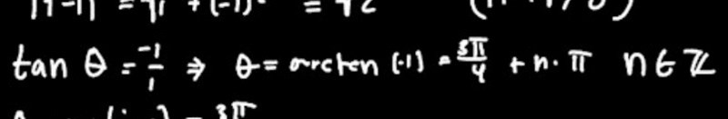 tan(θ)=1-1θ=arctan(-1)=-π4+n·π\tan(\theta)=\frac{1}{-1}\Rightarrow\theta=\arctan(-1)=-\frac{\pi}{4}+n\cdot\pi