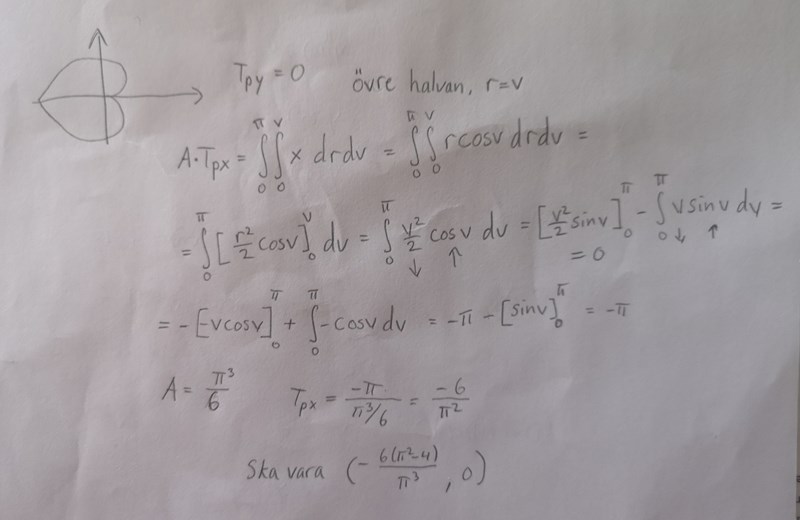 Ytelementet i polära koordinater är r dr dv, så det ska vara ett r till i integranden.
