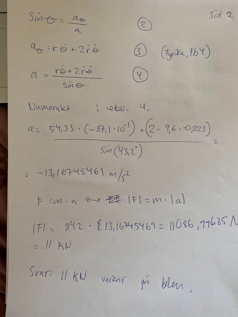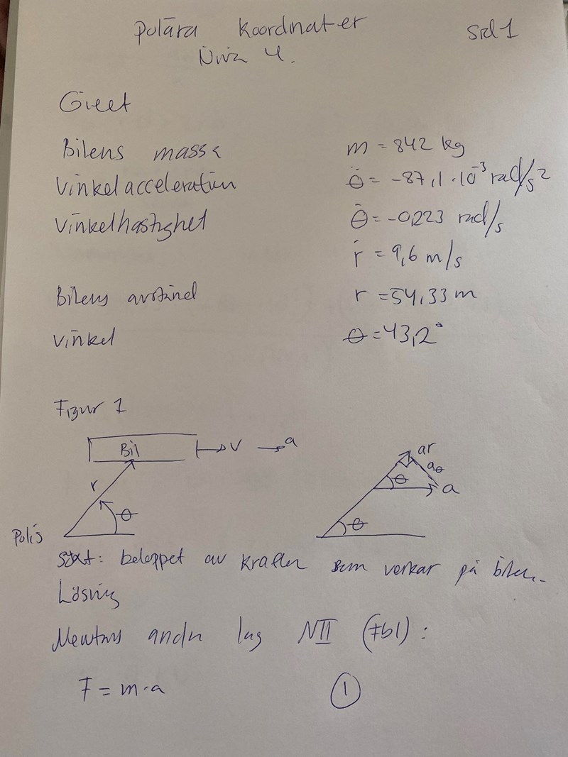Pieter Kuiper skrev:helsai skrev:En bil kör förbi en polisradar. Beräkna beloppet av kraften som verkar på bilen (som har massan 771 kg) om polisen mäter = 5,08 m/s², en vinkelhastighet = −0,245 rad/s
