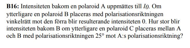 25o + 65o = 90o, och det står ju att polarisationsriktningarna för polaroiderna A och B är vinkelräta.