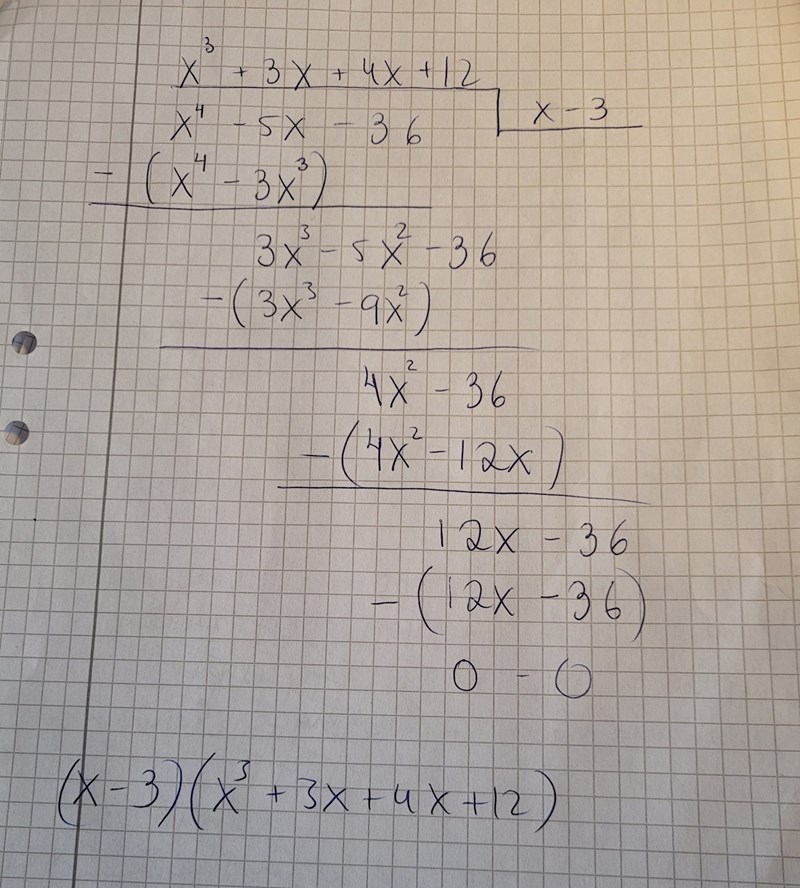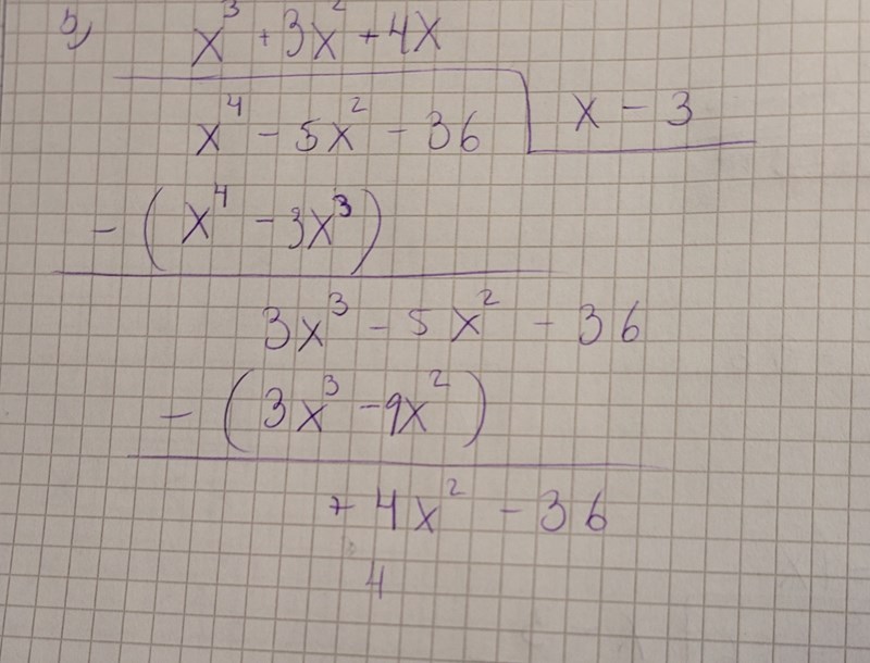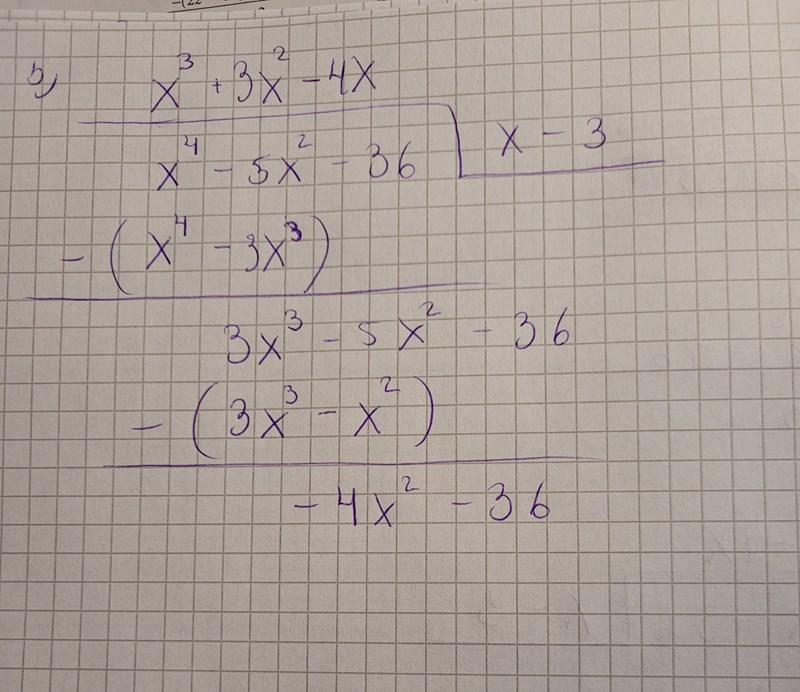 Du ska utföra den subtraktion som står i uppställningen, dvs helt enkelt beräkna x4-5x2-36 - (x4-3x3), vilket är lika med x4-5x2-36-x4+3x3.
