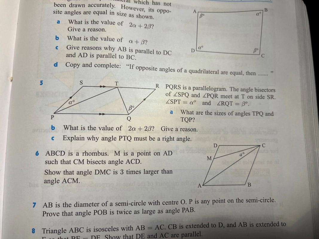 Har kört fast helt och hållet på uppgift 5. Enligt facit bör TPQ vara a och TQP vara B men förstår inte hur. Hur kan de vara samma vinkel om de är på samma sida, vilken regel följer detta.