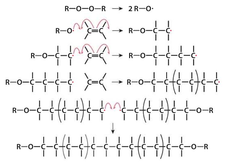Hej, reaktionen nedan är tagen från min lärobok och visar hur polymerisation av polyeten går till.