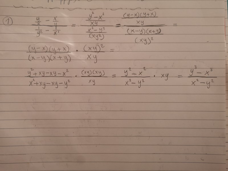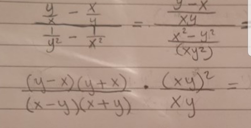 Men det gick en hel dag och har inte löst den än.. 😑 Täljaren blir som jag nämnde sist (y^2/xy) - (x^2/xy) och och nämnaren i hela bråket blir (x^2/y^2x^2) - (y^2/y^2x^2)