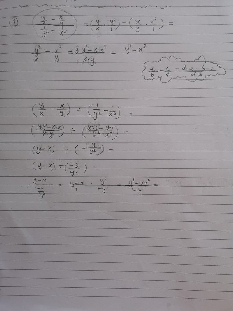 Hej, jag har den dubbelbråk uttryck i cirkeln som jag måste förenkla så långt som möjligt.. Jag gjorde det på två metoder, först fick jag y^3-x^3 och i den andra kunde inte gå vidare, På vilken sätt hade jag tänkt rätt?