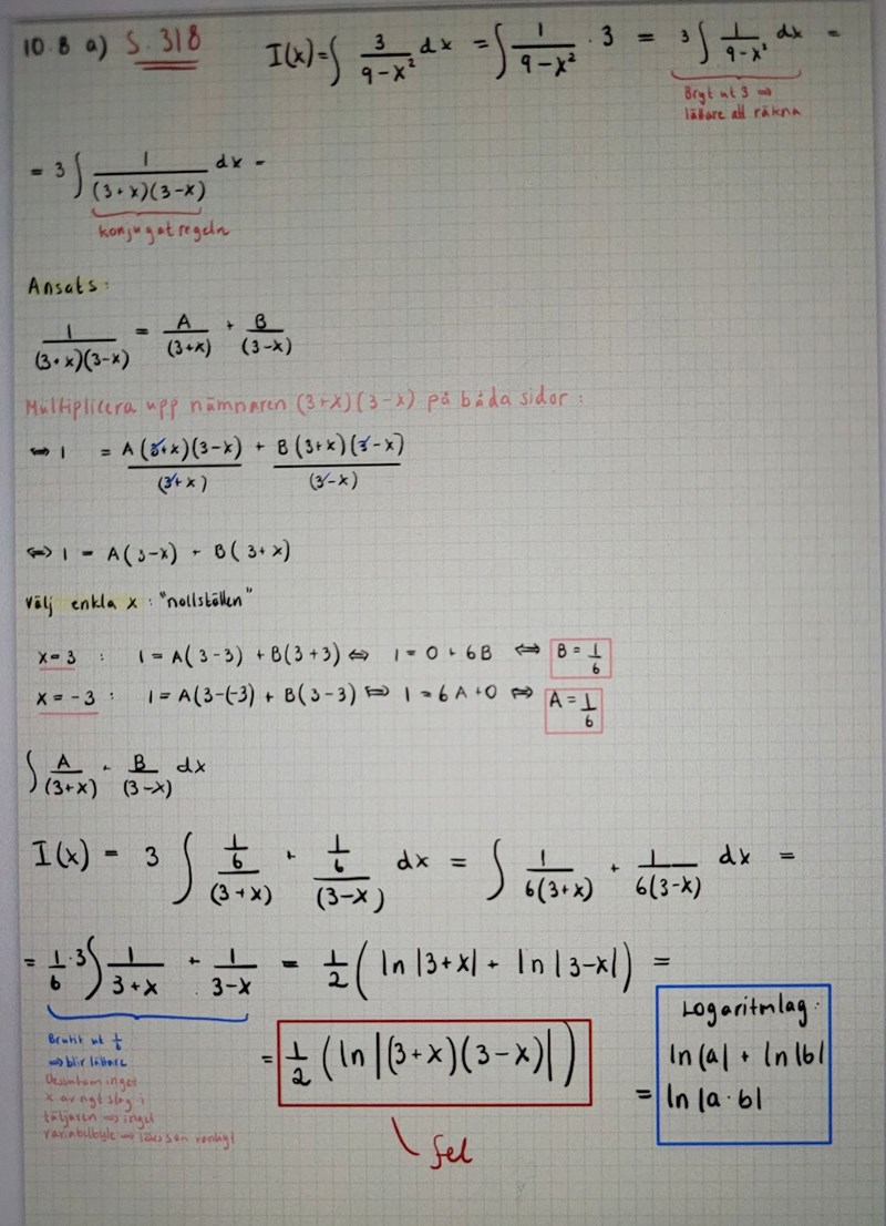 Men du har ju ett plustecken i integralen. Du har missat den inre derivatan av -x mellan likhetråerna ovanför din röda ruta.
