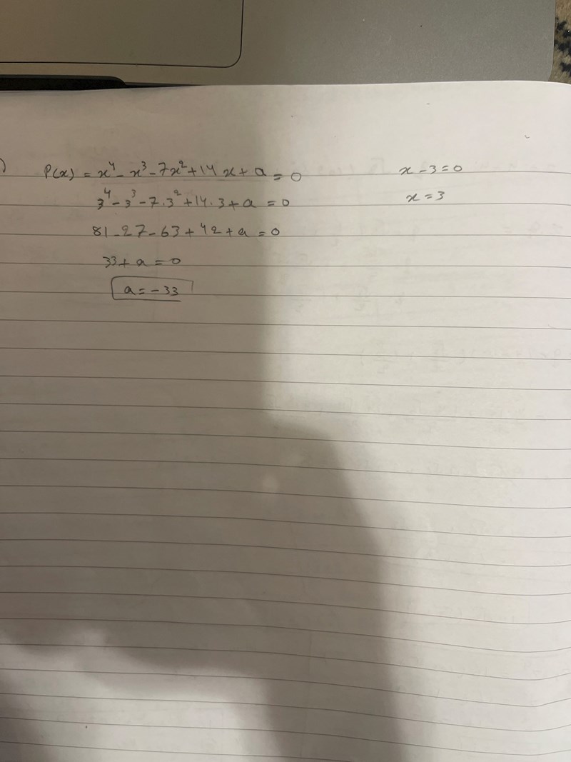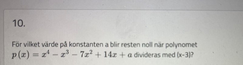 Är du med på att om vi får rest 0 kan p skrivas som p=(x-3)*(....). Vad händer om du stoppar in x=3?