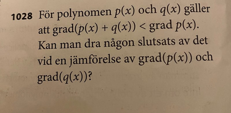 Jag tänkte att eftersom graden hos summan av två polynom kan högst vara graden på polynomtermen med högst grad så kan grad p(x) inte vara mindre än grad q(x). Detta är på grund av att självaste resultatets grad är mindre än graden hos polynomet p(x). Mitt svar var därför att grad p(x) > grad q(x). Dock är svaret att det är lika stora. Skulle någon snälla kunna hjälpa mig förstå var min logik brister?