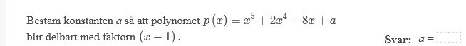 Nu har du här att du kan bryta ut (x-1) vilket innebär i detta fall att en av nollställena till polynomet är x = 1. För vilket värde på a stämmer detta?