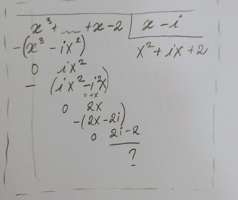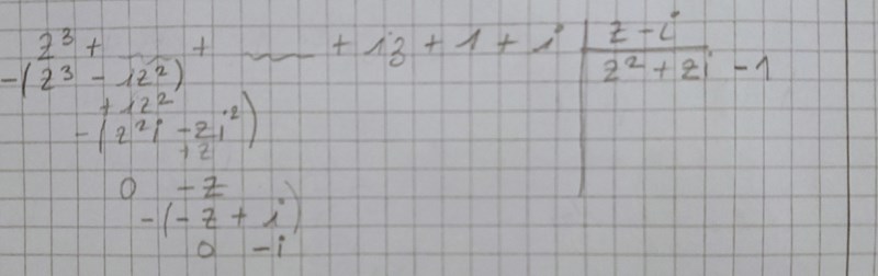 Ah men jag måste använda mig av den liggande stol. Polynomet är z3+iz+1+i och delaren är z-i. I början går det bra men efter blir det en soppa med i:or och z:or.