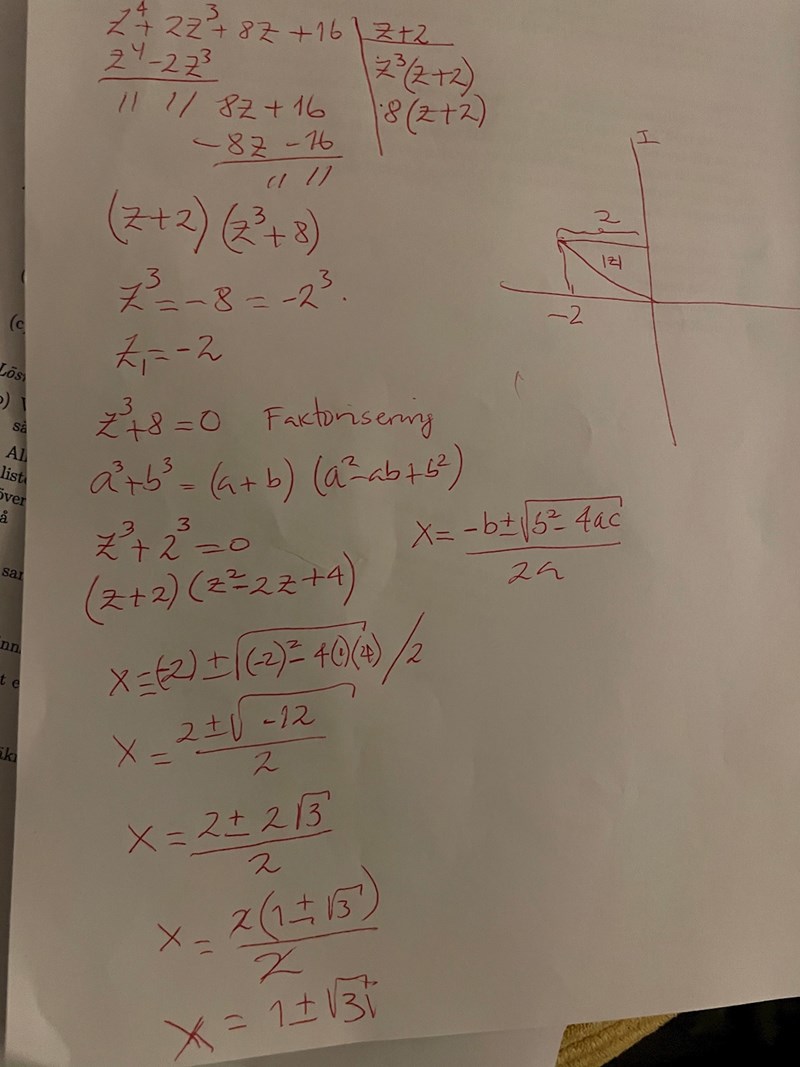 Om du faktoriserar ut (x+2) från (x^3 +8), polynomdivision om du vill, så får du en andragradare kvar. Den är väl smidig att lösa på rekrätangulär form, a+bi.