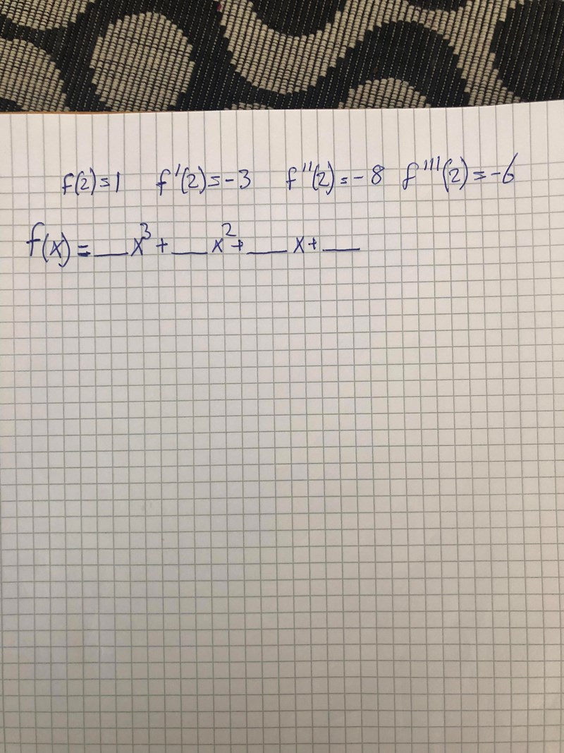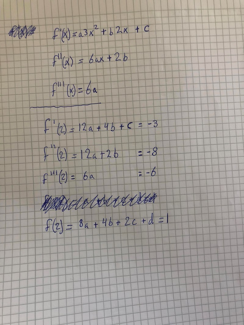 När du värl har f''(2) så kan du räkna ut d. Använd d och f''(2) för att räkna ut c o.s.v tills du har alla konstanterna.