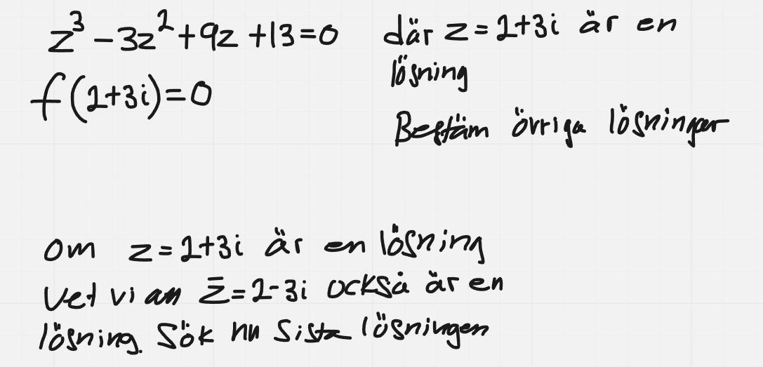 Eftersom polynomet har reella koefficienter så förekommer alla komplexa rötter i komplexkonjugerade par.