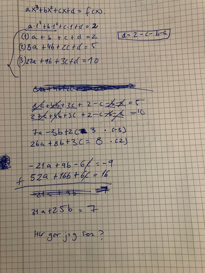 Man ska alltså kunna konstanterna med hjälp av de 4 angivna x och y värden att det ska vara en tredjegradsekvation.