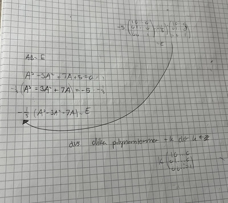 Du vill hitta en matris B sådan att AB = 1. Du vet att A3-3A2+7A+5 = 0. Vi vill ha en konstant 1, och vi har konstanten 5 där, så vi kan skriva om så här först: A3-3A2+7A = -5.