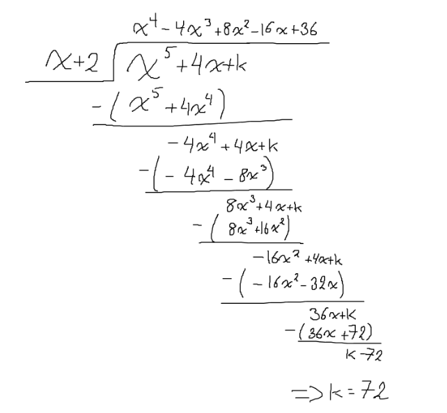 Man ska dividera x^5 + 4x + k med x+2 och få 0 i rest.