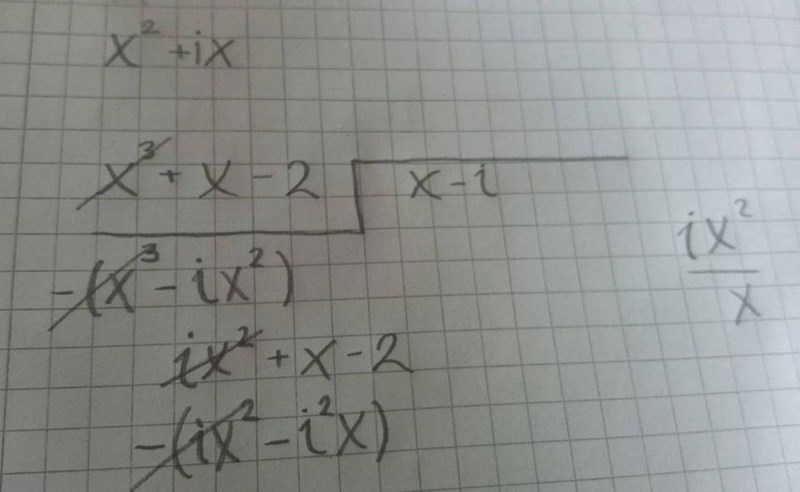 När du i divisionen fått fram så har du enbart -2 kvar, vilket inte är delbart med (x-i). Vi kommer inte längre. Då borde rimligtvis -2 vara resten.
