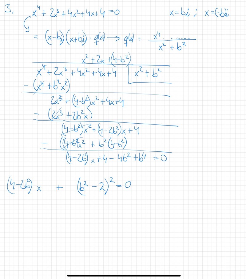 Jag hittade en alternativ lösning. Tänkte att om x = bi, så kan man sätta in det i fjärdegradsfunktionen och få att realdelen = 0 samt imaginärdelen = 0, då hela fjärdegradaren är lika med 0. Jag vill dock veta hur jag löser uppgiften som jag tänkte från första början, missar säkert något