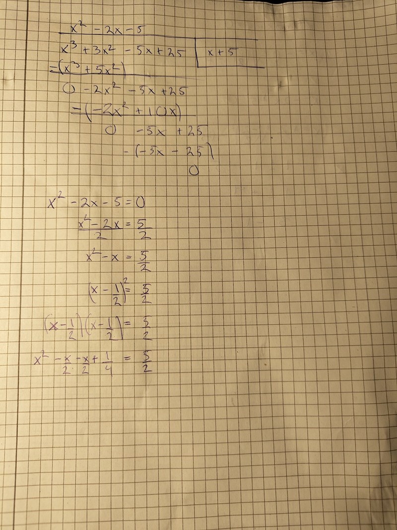 Hur skriver jag om x2 - x för att lösa ekvationen? Jag kan skriva det som x(x-1) men vet inte hur jag går vidare med det för att lösa ekvationen. Jag har dubbelkollat polynomdivisonen så andragradsekvationen jag ska lösa är x2 - 2x +5 = 0. Vet inte vad det är med denna ekvationen som gör det så svårt att lösa den men den har visat sig knivig. Tack igen!