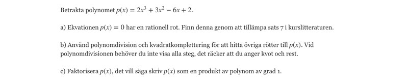 Jag ska alltså nu hitta de övriga rötterna till polynomet p(x)=2*x^3+3x^2-6x+2