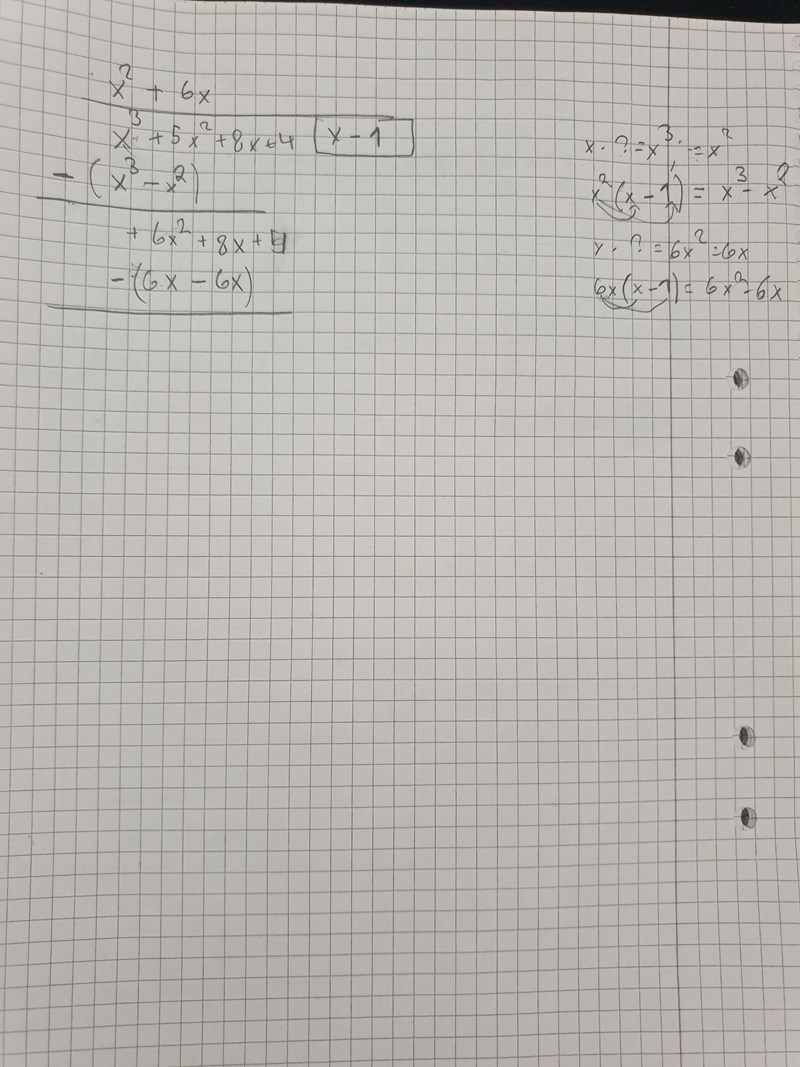 Altså när x=1 ska funktionen vara lika med 0. Det stämmer inte här. Så du kan inte dividera polynomet med (x-1). Hur kom du fram till (x-1) ?