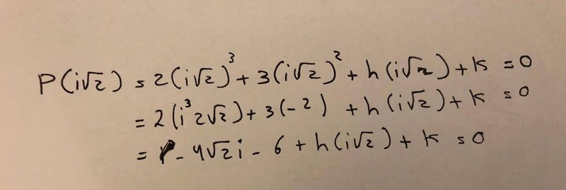 i*rotten ur 2 är en rot i ekvationen p(z)=0 med p(z)=2Z³+3Z²+hZ+k, där h och k är reella konstanter