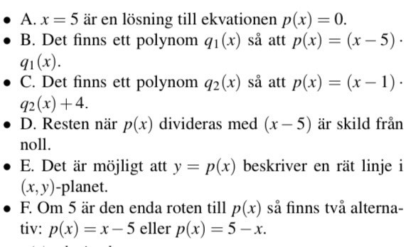 Problem: Låt p(x) vara ett polynom & antag att p(5) = 0 & p(1) = 4. Vilka av följande påståenden är sanna?